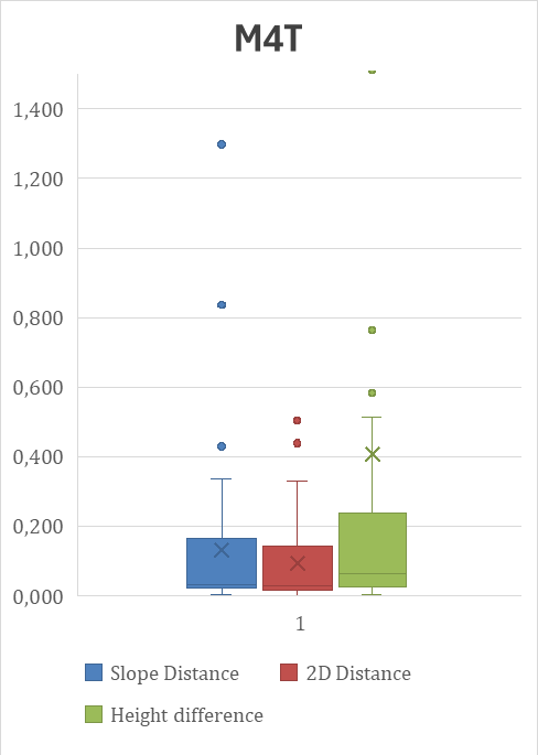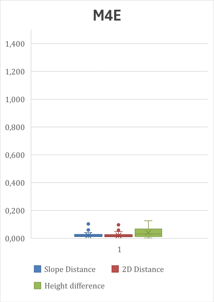 Boxplot-Diagramme der Messergebnisse von DJI M4T und M4E. Auffällig sind hier die Ausreißer bei der M4T, während die M4E durchweg hohe Genauigkeitswerte lieferte – auch bei hohen Fluggeschwindigkeiten. Das spricht klar für die Global-Shutter-Technologie, denn sonst sind die Bedingungen absolut identisch!